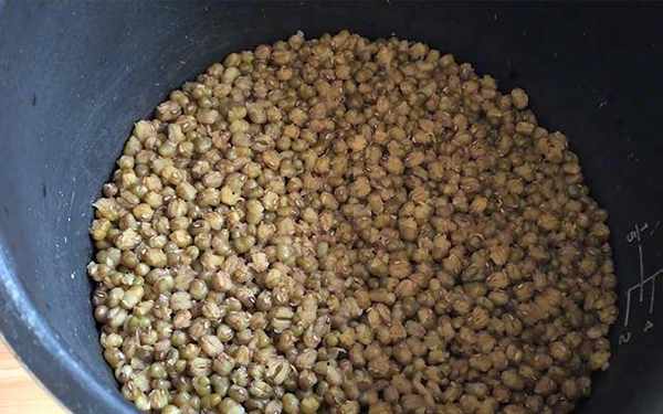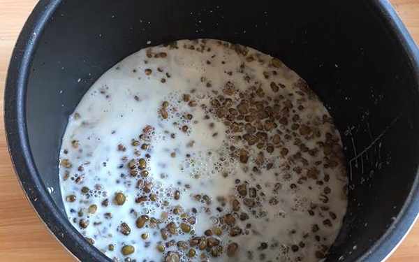 第一步:準備一碗綠豆,清洗幹凈,倒入高壓鍋中,加入不沾半個綠豆手指的清水,按下煮鍵調整最大壓力,煮至綠豆開花