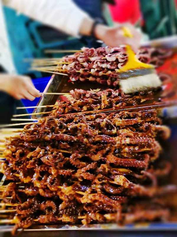 相比常見的鐵板魷魚和烤魷魚,章魚吃起來更加柔韌鮮甜,烤熟之後刷上秘制醬料和孜然辣椒,咬一口肉嘟嘟的超好吃!