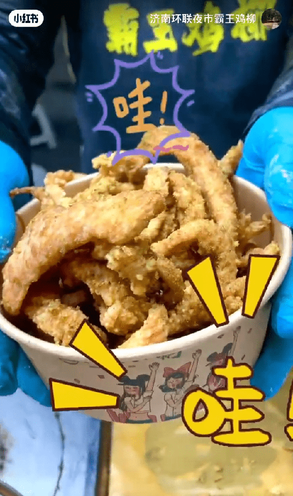 去過環聯夜市打卡的小夥伴很多都會安利的這個「霸王雞柳 」,自稱“濟南一絕”“雞柳的天花板”。