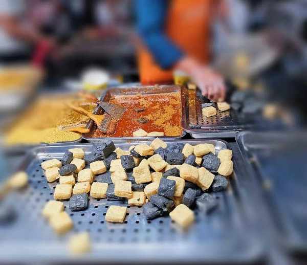 還有很受大傢歡迎的鍋包肉、福鼎肉片、烤腦花、臭豆腐等,各個攤位的吆喝聲此起彼伏,不少攤位前都排著長長的隊伍。