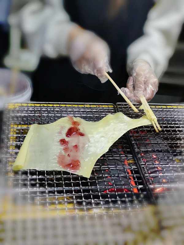 拿出一張牛奶制成的皮,放在烤爐上簡單地烤一下,再快速地刷上不同口味的醬,用簽字卷起來再繼續烤一烤,最後抹上一層煉乳,一份「 烤乳扇 」就完成瞭。