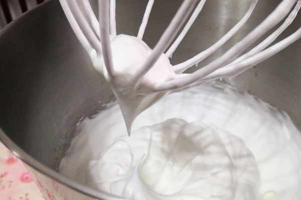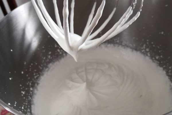 3.蛋白加入白糖用廚師機打發,打發時間大約在3—4分鐘左右,出現這種小尖鉤即可,