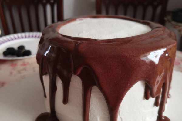 11.將巧克力甘納許慢慢沿著蛋糕頂層周邊淋下,巧克力甘納許就會慢慢自然流下,
