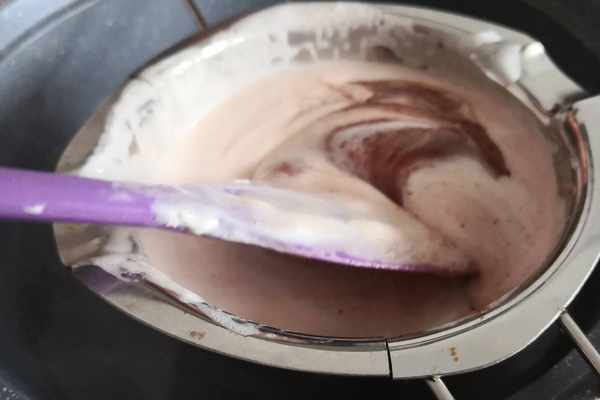 9.巧克力加入等量的淡奶油隔水融化且攪拌均勻,然後放涼至手溫裝入裱花袋裡,
