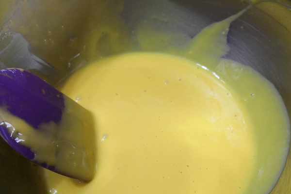 2.雞蛋蛋白與蛋黃分離,分別盛放在幹凈無水無油的容器裡,蛋黃加玉米油、牛奶、糖攪拌均勻,再篩入低筋面粉拌勻,切忌畫圈攪拌,