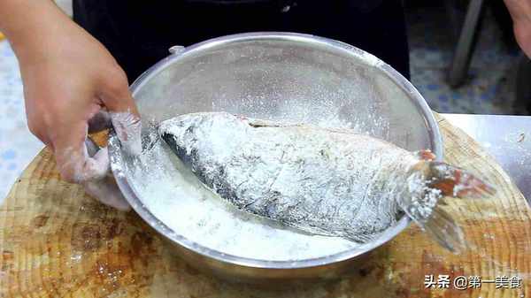 1.首先,我們準備好食材:一條幹凈的鯉魚,用手緊緊按壓以防打滑,每2厘米切一次,直到到達魚的骨頭而不穿透。加入2克鹽塗在魚身上,然後在魚的內外均勻撒上面粉。