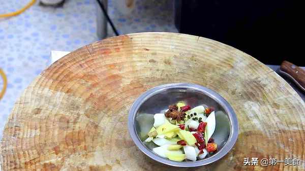 2.將一個白色的大蔥斜切成馬蹄片,將大蒜壓扁,放在一邊。把一塊生薑切成片,把它們和洋蔥、大蒜放在一起。然後,加入兩個八角茴香、1克花椒、1克幹辣椒和一個西紅柿。