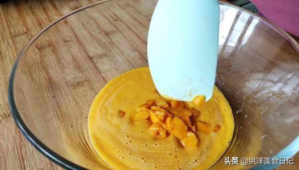 3.我們將芒果和芒果丁攪拌均勻,然後將一半的奶油倒入其中,然後使用翻面技巧將芒果醬和奶油攪拌均勻。不要畫圓圈以避免消泡。最後,我們將所有翻過來的芒果面糊倒入剩下的奶油中,再次攪拌均勻。