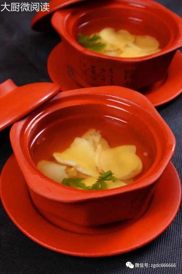 由於雞腿肉質地粗糙,血液含量高(血液吸附能力極強),可以最大限度地吸附大顆粒雜質;雞胸肉幹凈潔白,血液含量低,能吸附小顆粒雜質。此外,這兩種類型的雞肉都含有大量的蛋白質,也具有很強的吸附財產。經過兩次“清洗”後得到的湯呈現透明的淺棕色,味道非常濃鬱,成為紅燒魷魚蛋、山東海參、煮鮑魚等名菜。