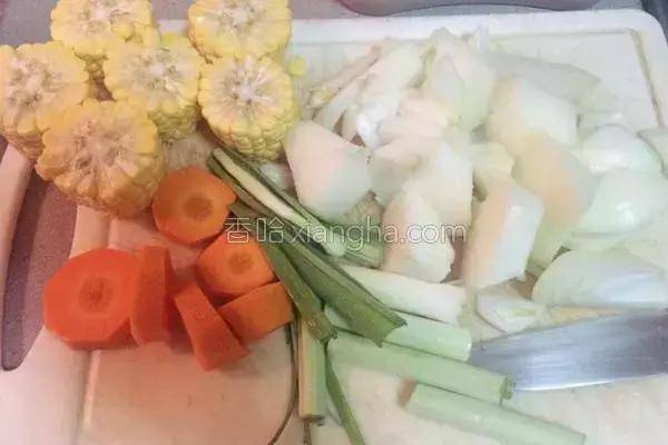 半隻雞、半個洋蔥、2個玉米、半個胡蘿卜和適量蔥花