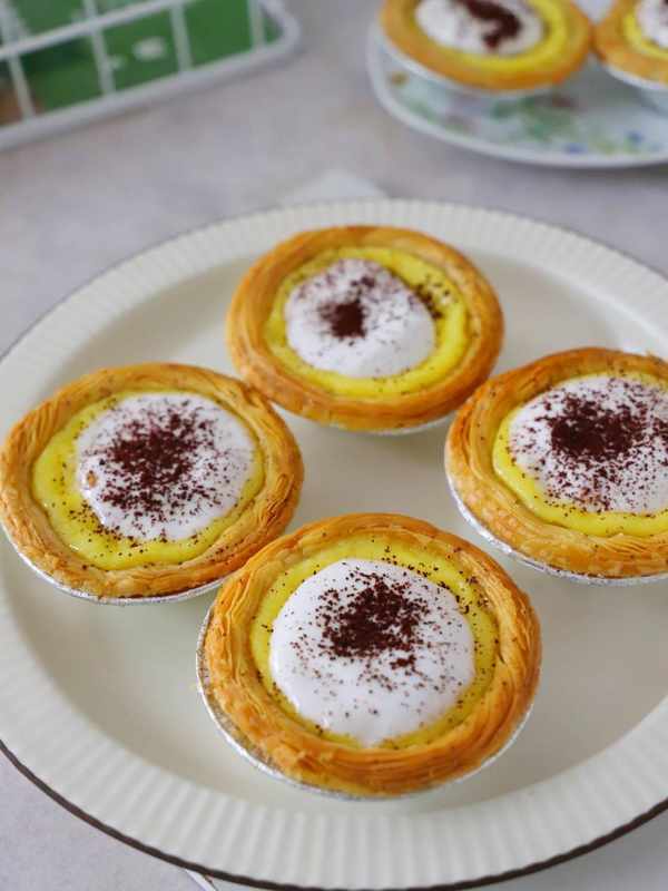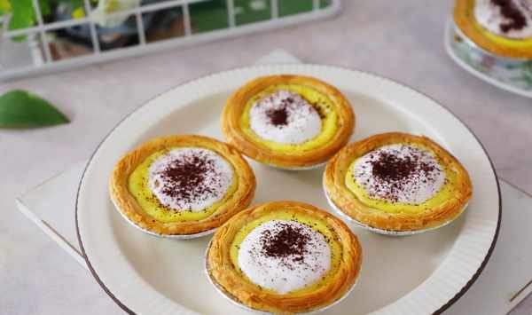 8、烤好的蛋撻表面篩上些可可粉就可以瞭,酥掉渣的撻皮,香軟的撻餡夾著微苦的巧克力,再配上軟綿的棉花糖,咬上一口四層口感,真的是太滿足瞭。