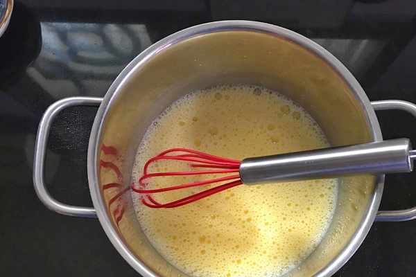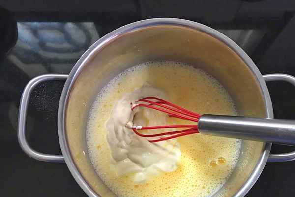 3、加入180克淡奶油,和蛋液一起攪打均勻。