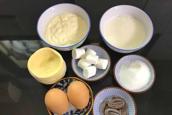 【做法】:1、準備好材料,牛奶110克,淡奶油180克,雞蛋1個,蛋黃1個,白砂糖50克,巧克力12個,棉花糖12粒,蛋撻皮12個,這個量正好做12個,可根據自己需要自行增減。