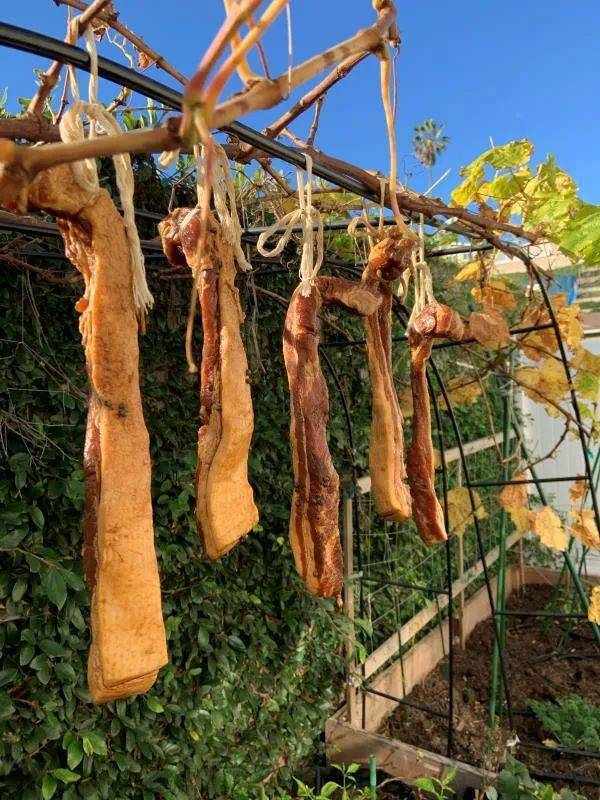 看瞭一下方子,與我傢以前做醬油肉差不多,成品的顏色淡一點,攝影時光線好,臘肉呈現琥珀紅,頗為漂亮。我想,人傢幾十萬粉絲的網紅臘肉總歸有一定的道理,就按照方子上寫的做。女兒從Costco買瞭5條豬五花肉,隔夜擦幹血水,用花椒和海鹽醃,重物壓在肉上。第二天倒去血水,用生抽、蠔油、蜂蜜將肉反復搓揉後,肉盤在器物中蓋上保鮮膜放冰箱冷藏瞭三四天,中途翻幾次身。然後用細繩子將醃制入味的肉條一頭綁上,垂掛到後院有風和太陽的地方晾曬。