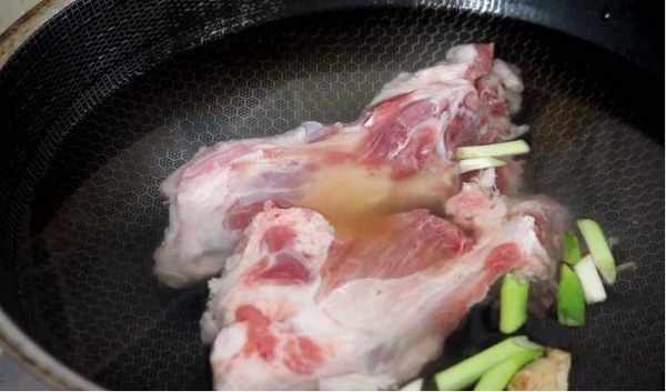 3.接下來,在大骨頭中加入適量的水,然後再次清洗。一定要清洗一會兒。清洗幹凈後,我們可以直接把它放進鍋裡,加入適量的冷水,然後加入蔥、薑、料酒去腥味。