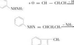 Fischer法制備3-甲基吲哚:丙醛與苯肼加熱脫去水分子得丙醛苯腙,然後與氯化鋅或硫酸加熱,脫去氨分子環合得到3-甲基吲哚。圖源:參考文獻[7]