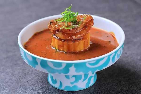 原料:6頭鮑魚1個、貝貝南瓜1個、蠔油5克、老抽2克、雞汁3克、白糖4克、曾味黑松露醬15克、曾味黑松露油8克、濃湯300克 水淀粉適量