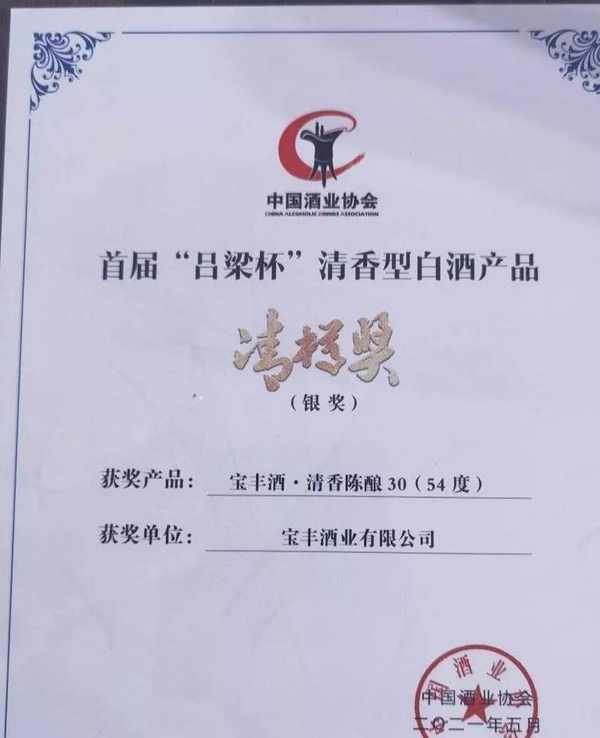 此次論壇還舉辦瞭首屆“呂梁杯”清香型白酒產品“清樽獎”評選活動,寶豐清香陳釀30憑借清香純正的口感,榮獲首屆“呂梁杯”清香型白酒產品“清樽獎”。