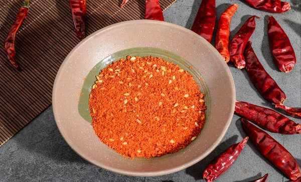 材料:辣椒面(粗辣椒面250g、細辣椒面250g)、熟芝麻75g、鹽5g、雞精2g、香菜莖、蔥薑、洋蔥、八角、香葉、桂皮、小茴香、高度白酒少許