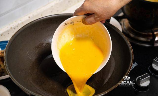 先把雞蛋放下去煎,煎定型瞭就可以盛出鍋備用瞭。