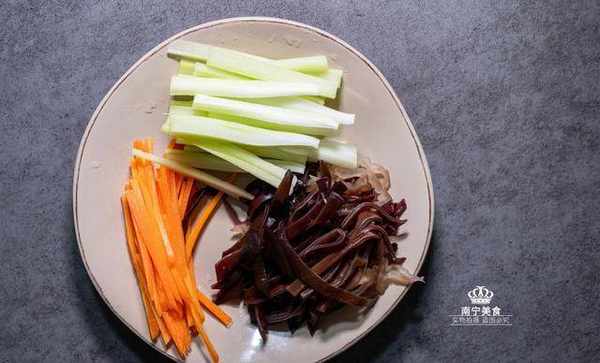 1、把我們準備的胡蘿卜、芹菜和木耳洗幹凈切成絲備用,如果我們買回來的是木耳幹,那就需要我們提前泡發。