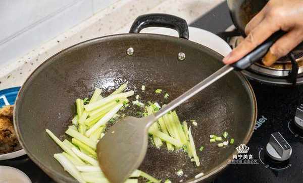 我們先加入芹菜是因為芹菜含有比較多的亞硝酸鹽,先炒芹菜也可以讓芹菜的香味散發出來,這道菜就更加香。