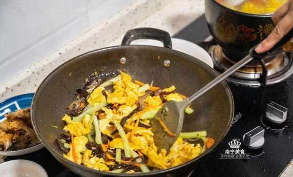兩三分鐘加入炒好的雞蛋,翻炒一分鐘,使它們的味道充分融合在一起。