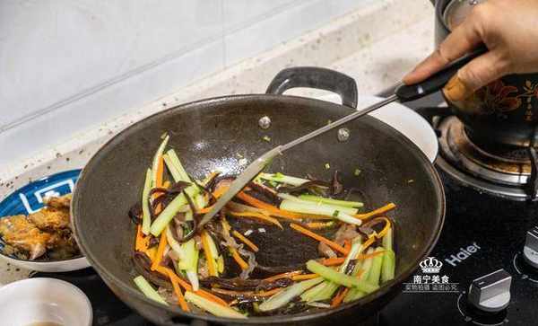 4、芹菜炒到斷生之後我們把胡蘿卜、木耳也加進去一起翻炒。