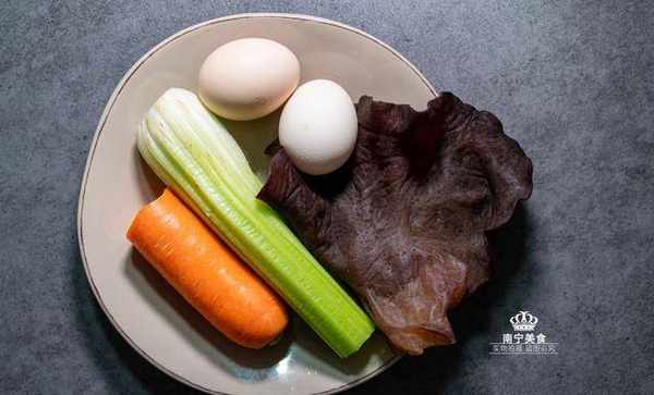 準備食材:半根胡蘿卜,半棵芹菜,50克木耳,兩個雞蛋