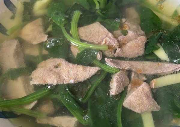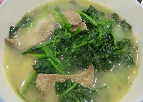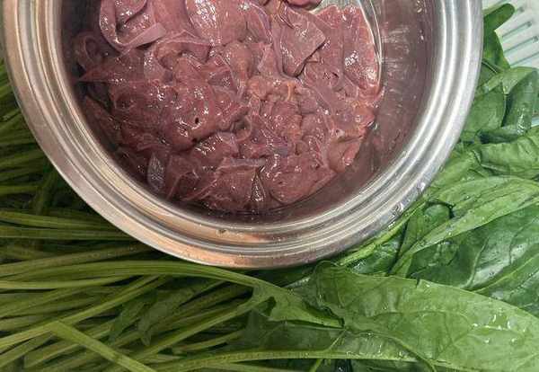 【食材】:豬肝100克、菠菜1把、香油、胡椒粉、料酒、食鹽。