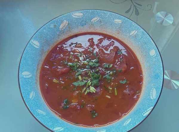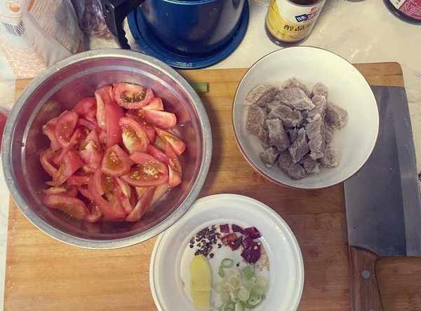 【食材】:牛肉300克、西紅柿2-4個、幹辣椒2-4(個人口味添加)、蔥1根、薑3片、蒜3瓣、花椒若幹粒、八角2個、番茄醬2-3勺(個人口味添加)、鹽適量、生抽適量、原味鮮適量、熱水1壺。