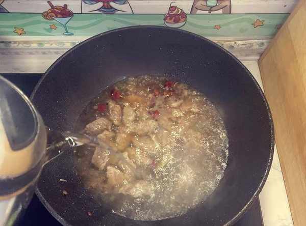3、起鍋倒油,油熱後先把香料爆鍋,炒香後放牛肉繼續翻炒,接著倒入熱水,加入適量生抽,開中小火開燉,至少半小時(一定要是熱水,冷水挺毀湯味的)。