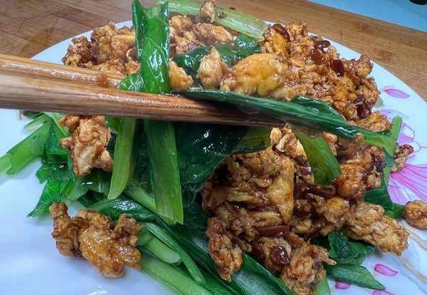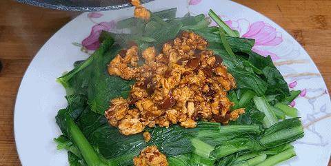 3、炒好之後蓋在焯過水的小白菜,拌一拌即可