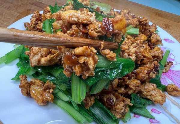 9.將炒好的雞蛋醬蓋在小白菜表面,美味即享