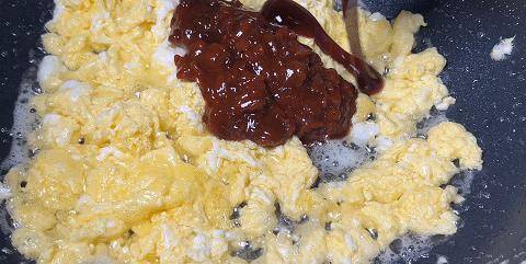 6.用鏟子炒成雞蛋小塊,加入一勺半黃豆醬