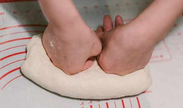 2、松弛面團發酵到兩倍大的時候,要松弛面團,進行排氣的處理。面團發酵以後中間很多氣孔,需要揉面把裡面的空氣排出,然後松弛面團。