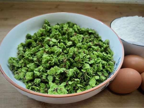 1、做煎餅隻需一把榆錢就可以瞭,4月份的榆樹錢錢完全舒展開瞭,特別鮮嫩,再準備3個雞蛋,適量面粉。