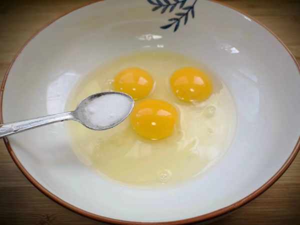 3、取一個大盆打入3個雞蛋,加少許鹽,用筷子充分攪拌均勻。