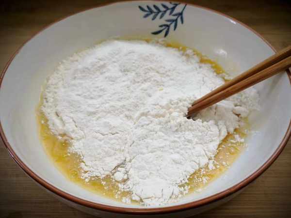 5、接著倒入適量的清水,慢慢攪拌成糊狀,面糊攪成可以拉成絲即可,不能太稠或者太稀,放置5分鐘。