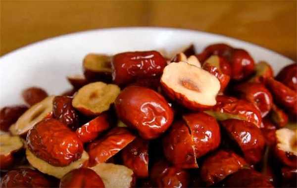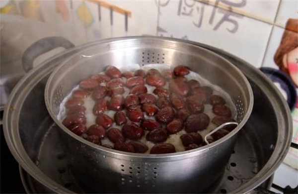2.再準備點紅棗洗幹凈,給它切成兩半。