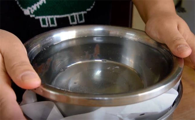 6.咱們這個蒸好的切糕先不要急著吃,準備上一張籠紙或者是籠佈,把它鋪在上面,然後壓一個比較重的盆子,靜置半個小時。