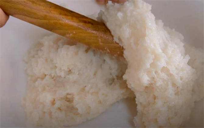 3.糯米蒸好瞭,咱們把它取出來,找一根搟面杖出來,把這個糯米搗黏糊一些,咱們把它搗成這樣粘成一團的狀態就好瞭。
