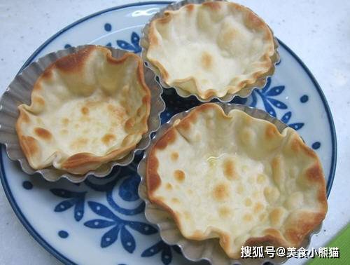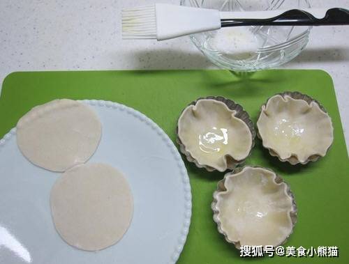 2、水餃皮很隨性不修邊幅的放入在小塔模內,刷上薄薄的橄欖油。