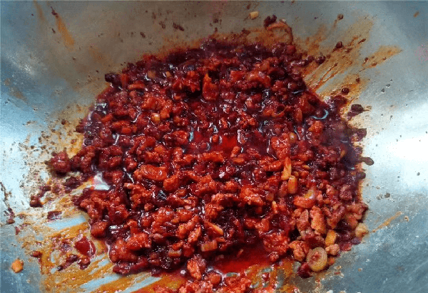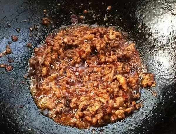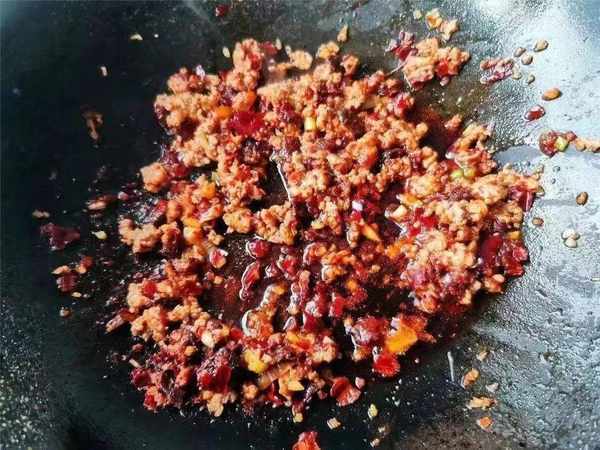 另外起鍋燒油,等油溫七成熱,倒入蔥末、蒜末、薑末、豬肉末、紅椒粒,小火翻炒出香味,速度一定要快,火候掌握好,別炒糊瞭。接著倒入一勺豆瓣醬,豆瓣醬是麻婆豆腐靈魂,必不可少,喜歡重口味的小夥伴,還可以額外放點辣椒面,小火炒出紅油。