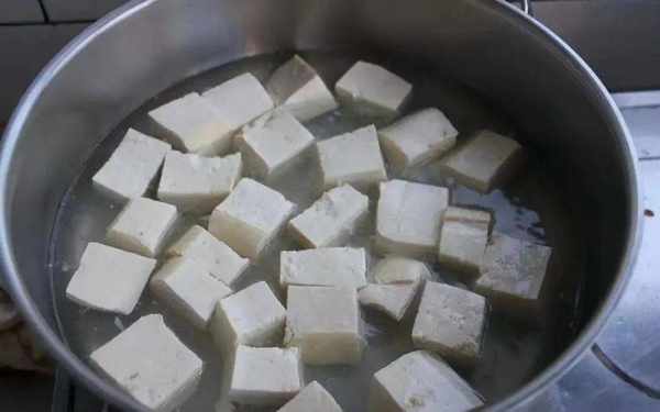 準備一塊嫩豆腐,切成小塊,起鍋燒水,加入適量的鹽,焯燙大約3-5分鐘,大火煮滾後立即離火,先不要撈出,靜置幾分鐘。
