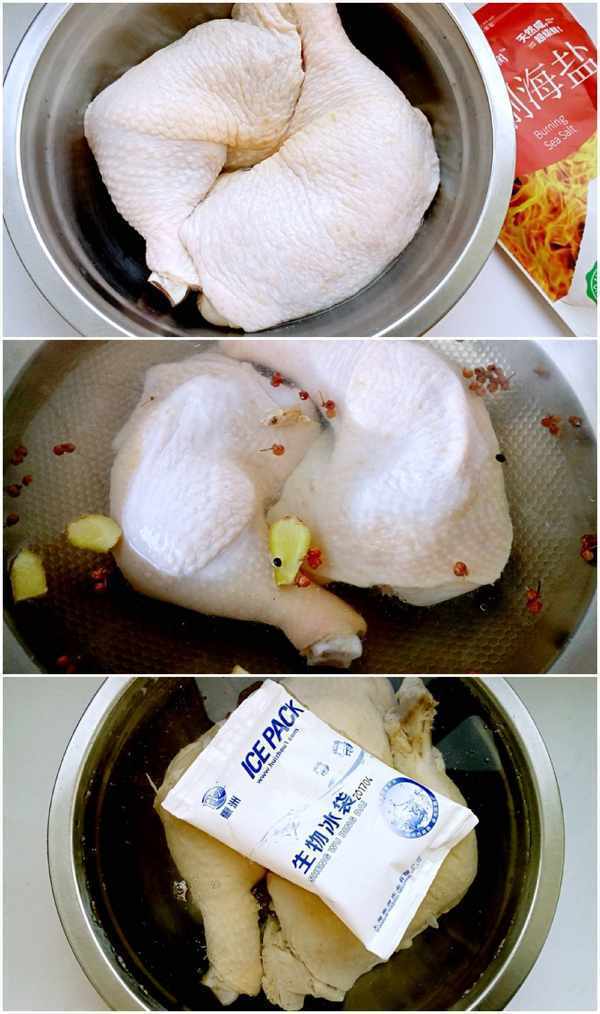 1.準備好雞腿肉,放入薑片和鹽煮熟,撈出迅速用冰水冷卻