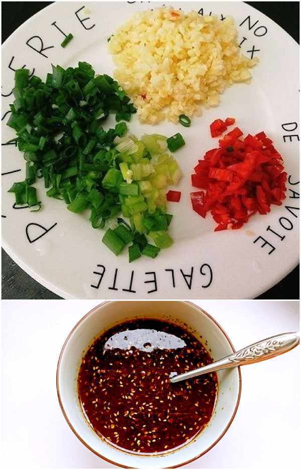2.準備好配料和醬料(適量雞湯、辣椒油、小芝麻、1勺鹽、2勺醋、2勺老抽、2小勺白糖。)