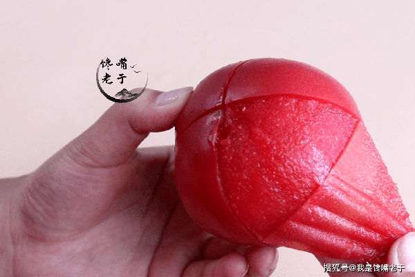 3、最後一點,做糖拌西紅柿時一定要把西紅柿的外皮撕掉,這樣吃起來口感更佳!去皮的時候,記得在頂端處劃十字花刀,用沸水燙大約30秒左右即可。