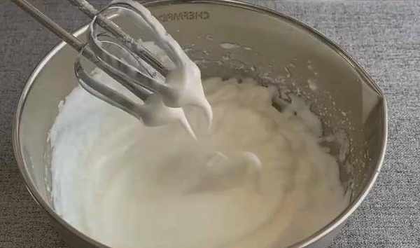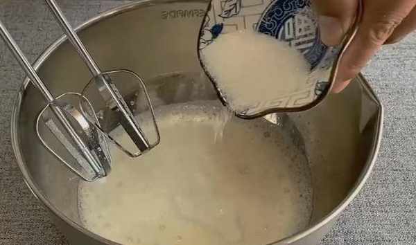 第二步,用打蛋器把蛋清打發,打至顏色變白,加入十克白糖,再次打發,打至蛋清起紋路,再次加入十克白糖。