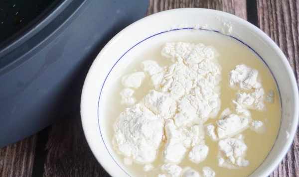 3、再煎的時候,外面準備一碗面水,這個就是鍋貼做好之後,焦黃酥脆,不粘鍋,不會糊的訣竅。面水一共100g,面粉和水的比例是1:9,一起加入碗中攪拌均勻,直到表面沒有幹粉就可以瞭。